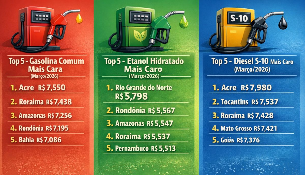Gasolina comum mais cara por estado (março/2026):
